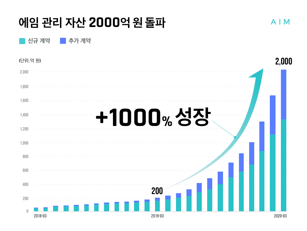 핀테크 자산관리 자문 플랫폼인 에임(AIM)이 3월 31일 누적 관리자산 2,000억원을 돌파했다고 밝혔다. 지난 1월에 1,000억원을 돌파한지 4달 만에 두 배 이상 성장했다.