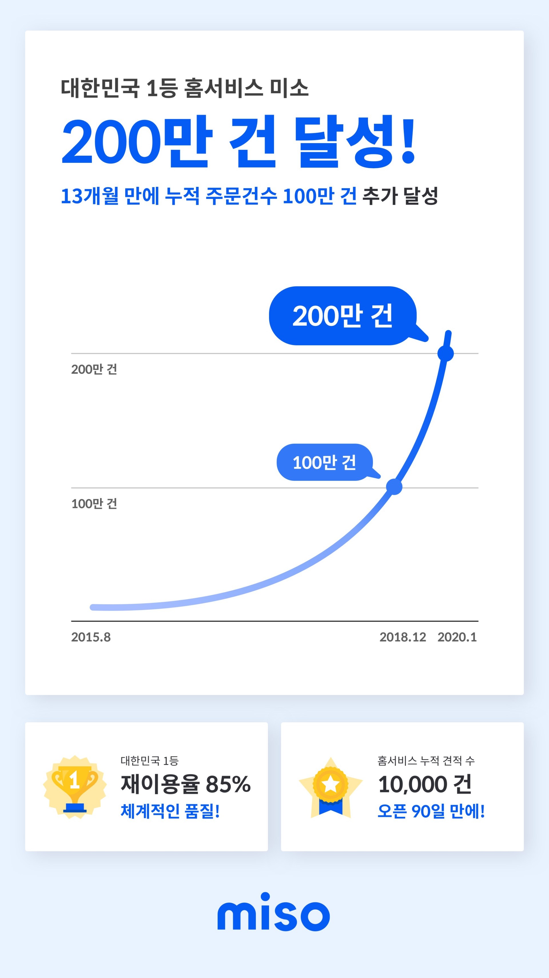 미소의 빅터 칭 대표는 “이번 누적 주문 200만 건을 달성을 통해 미소가 대한민국 1등 홈서비스 브랜드임을 다시 한 번 증명하게 되어 기쁘다”며 “미소에 보내주시는 고객의 변함없는 성원에 보답하고자 서비스 향상에 더욱 매진하겠다”고 전했다.