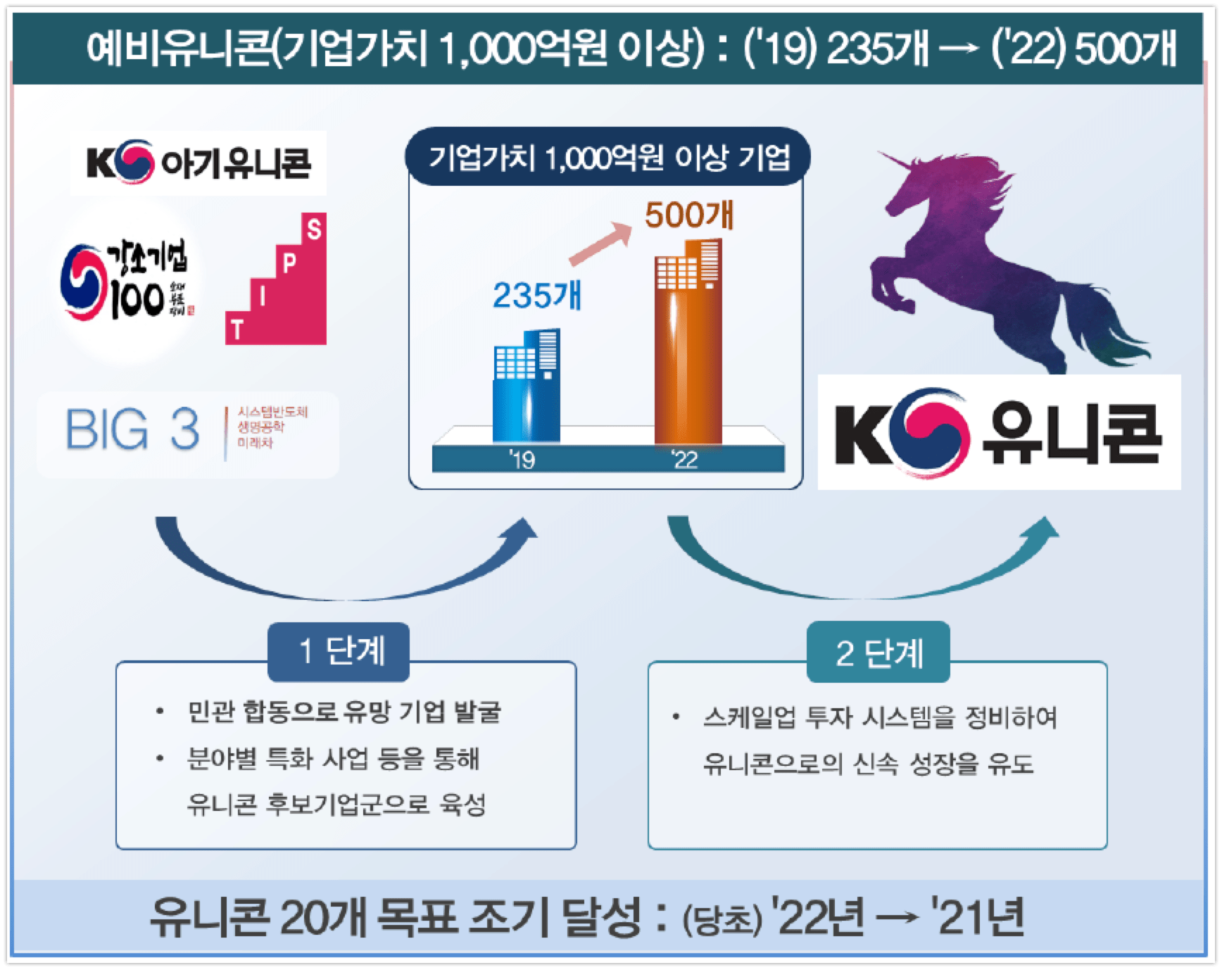 이상 1단계 프로그램을 통해서는 기업가치가 1000억원이 넘는 예비유니콘을 오는 2022년까지 500개로 늘려 2019년(235개) 대비 2배 이상 확대할 계획이다.