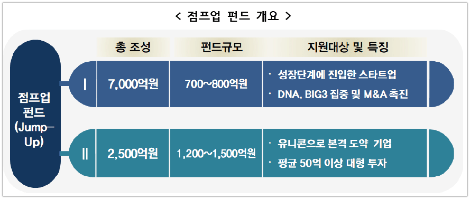 먼저 예비유니콘의 후속 도약단계를 지원하는 ‘점프업(Jump-up) 펀드’를 1조원 규모로 조성하여 BIG3 & DNA 등 4차 산업혁명 분야의 성장단계 기업, 유니콘 도약단계 기업에게 투자하도록 한다.