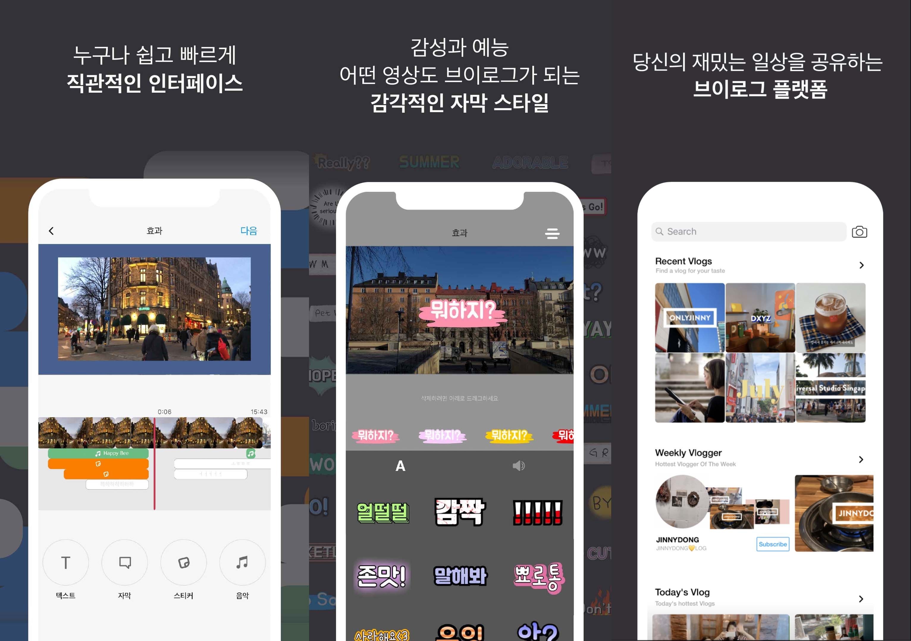 브이로거(Vlogr)는 10~20분 길이의 ‘일상 공유 영상’을 가장 쉽고 트렌디하게 만들어주는 영상 편집 앱으로 현재 앱스토어에 출시되어 있다. 일상을 생생하게 스토리텔링하는 형식의 ‘비디오 블로그’ 는 2018년부터 유튜브에서 가장 인기 있는 영상 카테고리가 되었으며 여전히 높은 인기를 구사하고 있다.