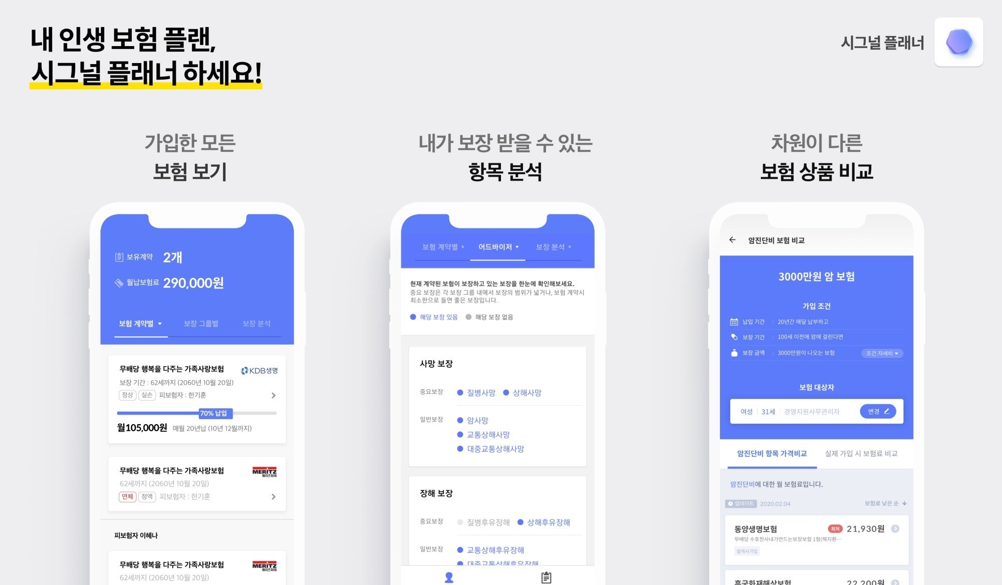 보험 분석 서비스인 ‘시그널 플래너’는 개인이 가입한 모든 보험을 분석하고 관리할 수 있는 서비스로 설계사용 앱과 일반 고객용 앱으로 선보이고 있다. 지난 해 7월 선보인 설계사용 앱은 현재 국내에서 활동 중인 약 40만 명의 설계사 중 약 7만여 명이 사용 중이며, 일반 고객용 앱은 지난 해 12월 출시해 빠르게 성장 중이다.
