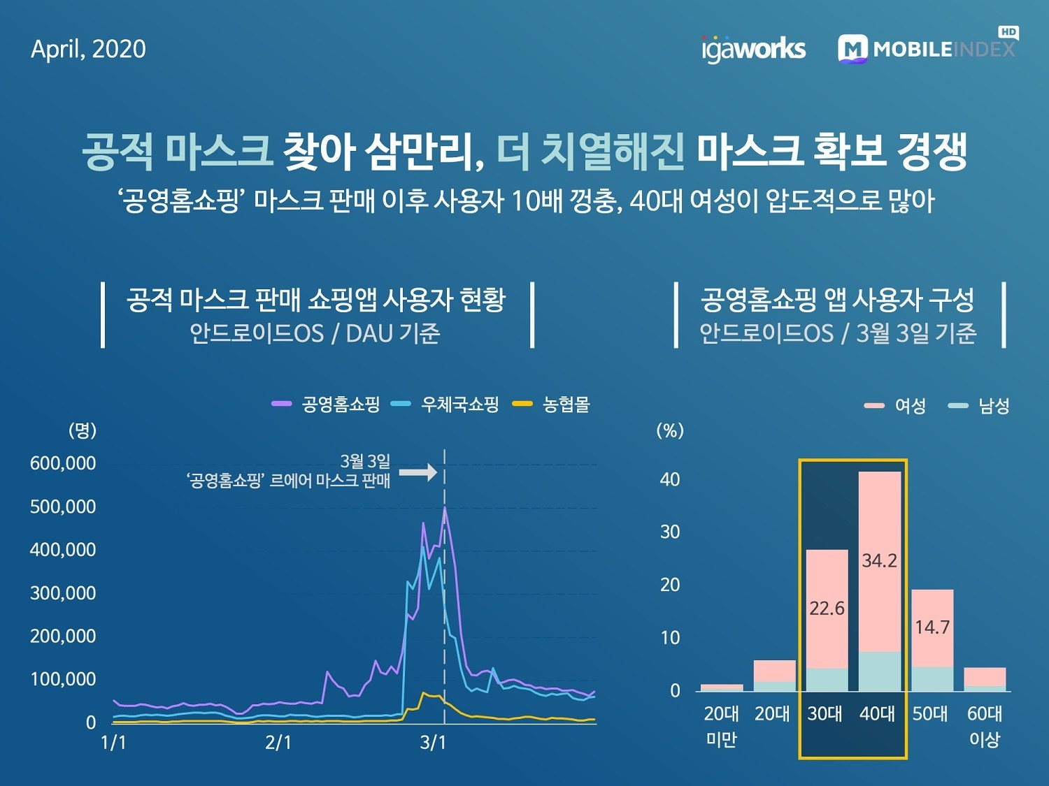 지난 3월 3일에 ‘공영홈쇼핑’에서 르에어 마스크 판매 이후 사용자가 10배 늘어난 것으로 분석됐다. 공적 마스크 판매처인 우체국과 농협도 성장세가 두드러진다.