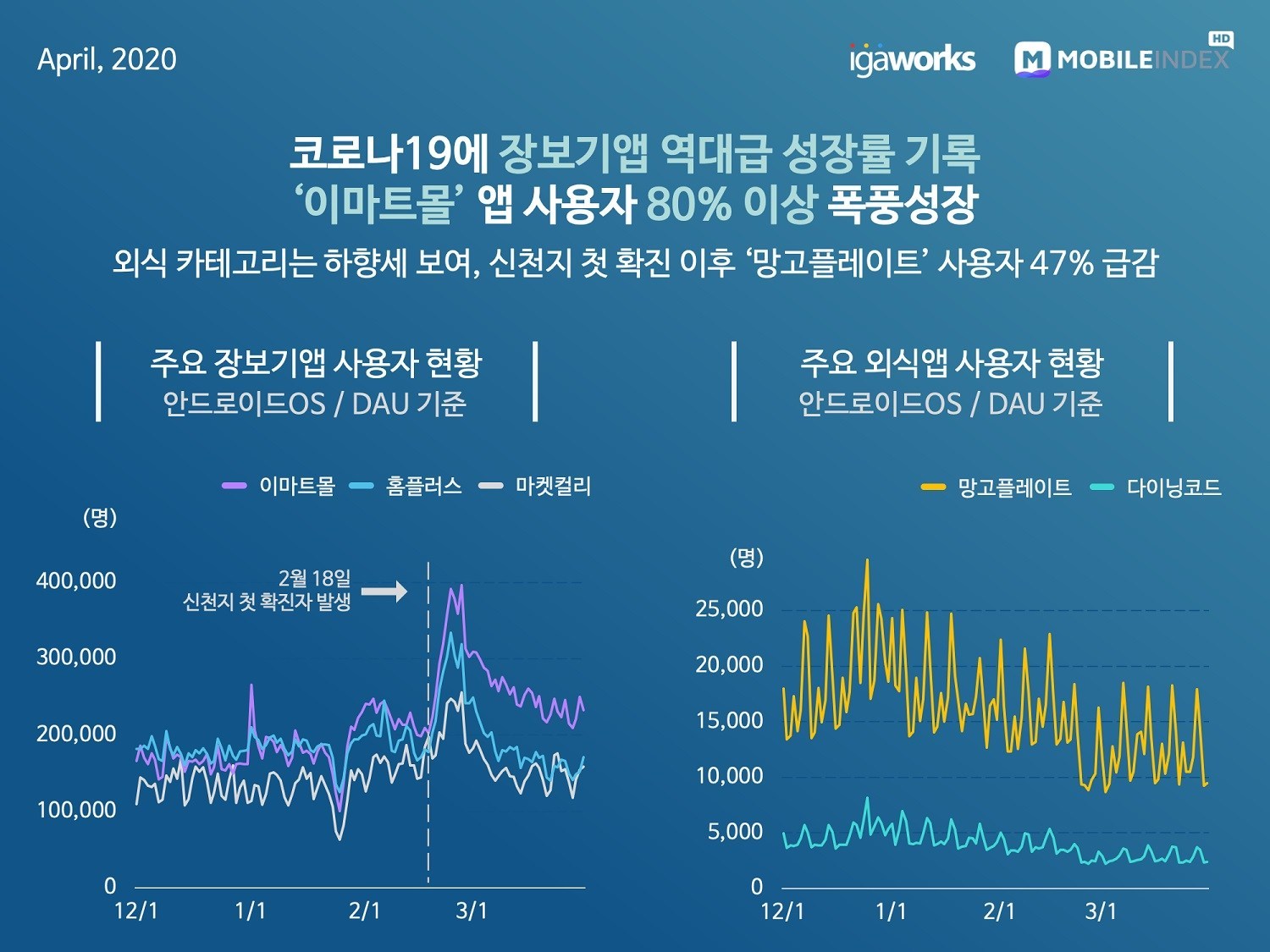 지난 2월 18일에 신천지 집단감염의 첫 확진자가 발생하면서 모바일 장보기 앱 사용자가 급증했다. ‘이마트몰’은 무려 81% 급증했으며, ‘마켓컬리’ 77%, ‘홈플러스’는 49% 증가했다.