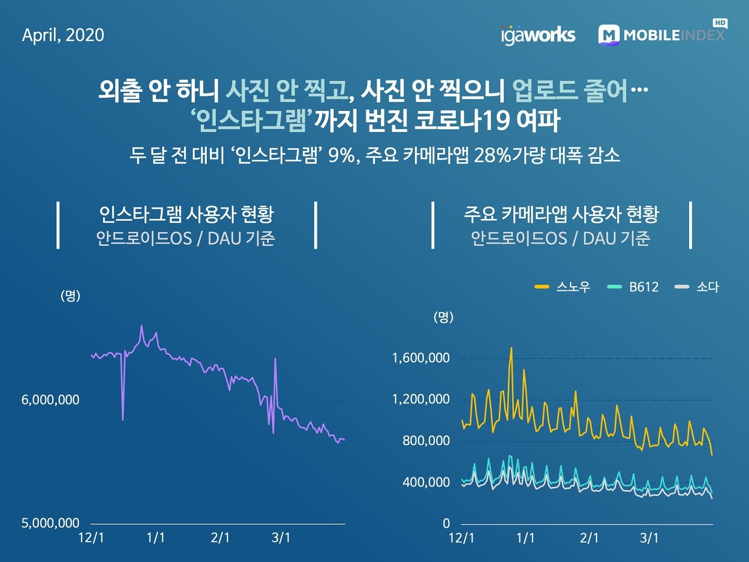 ‘인스타그램’의 1월 첫째 주 평균 사용자는 646만명이었으나, 3월 첫째 주 평균 사용자 585만명으로 9%가 감소했으며, 카메라 앱 1위 ‘스노우’는 동기간 무려 29%의 사용자 감소를 보였다.