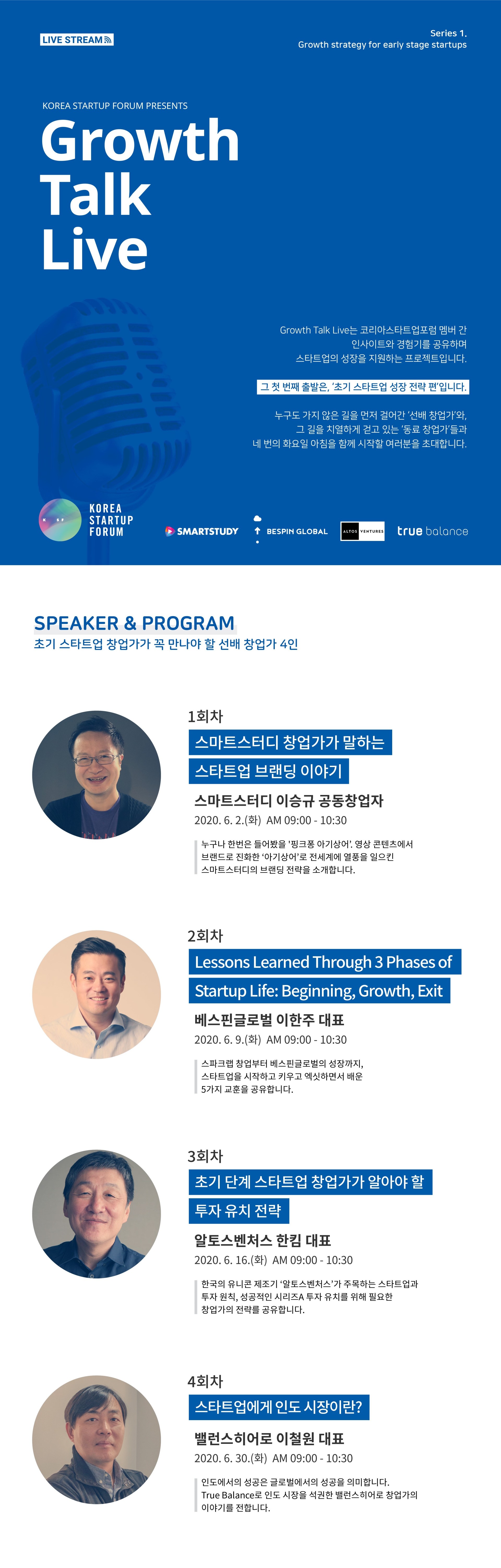 Growth Talk Live의 첫 번째 시리즈로 ‘초기 스타트업 성장전략 편’을 준비했다. 창업 초기부터 시리즈A 투자유치 전 단계에 있는 창업가들의 역량 증진에 필요한 브랜딩, 투자유치, 해외진출 등을 주제로 다루며, 창업 과정을 먼저 경험한 대표적인 창업가 및 VC가 연사로 첫 시리즈의 포문을 연다.