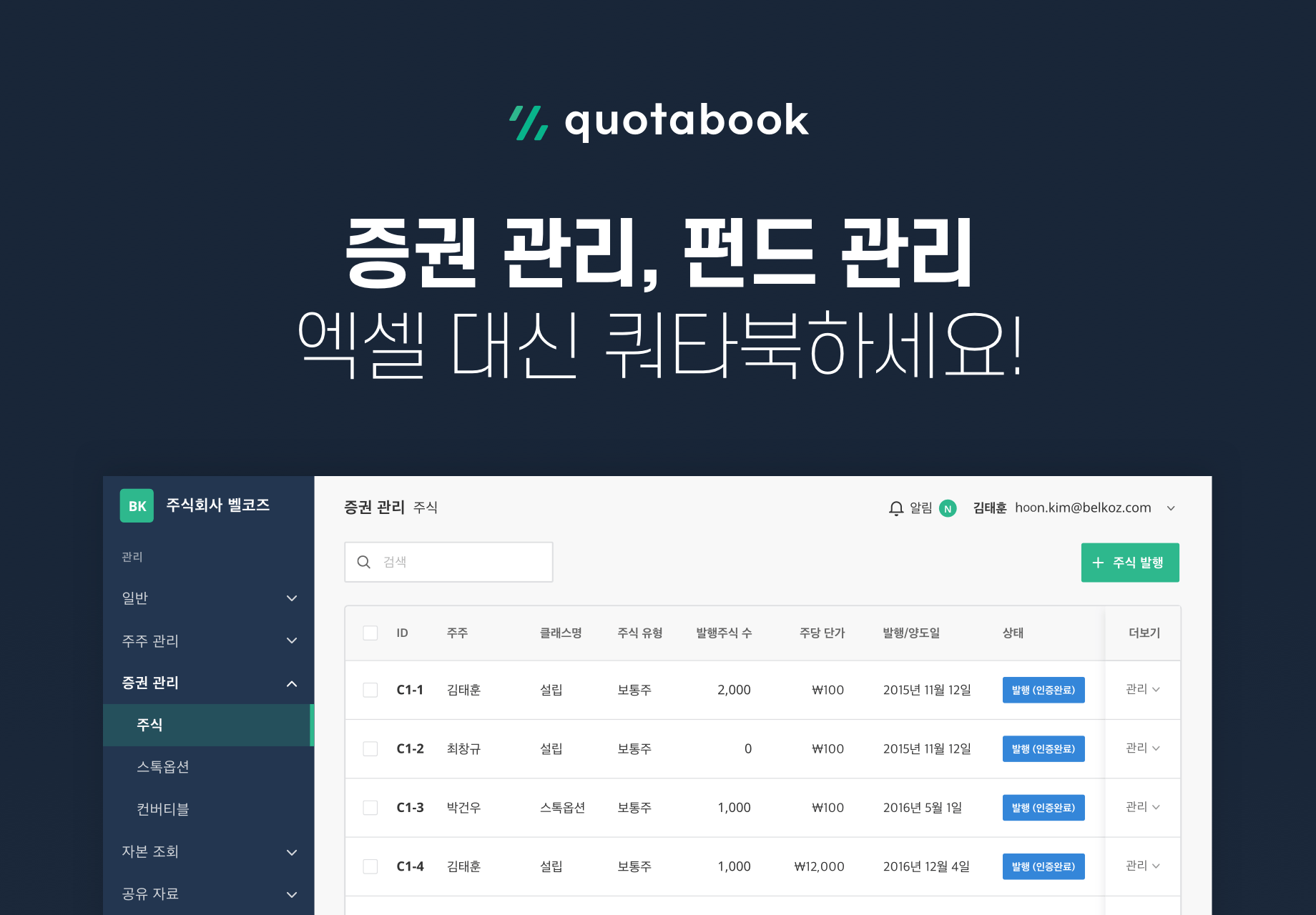 쿼타북은 스타트업과 투자자에게 증권 및 펀드 관리 서비스를 제공하고 있다. 스타트업은 회사 설립 시부터 발생하는 증권 변동 이력 및 스톡옵션 내역 전부를 온라인 주주명부로 관리할 수 있으며, 이를 기반으로 영업 보고, 주총, 이사회 등 경영 관련 제반 사항 및 커뮤니케이션을 효율적으로 처리할 수 있다. 투자자는 개인 투자 포트폴리오 혹은 펀드의 정확한 수익률을 실시간으로 확인할 수 있다.