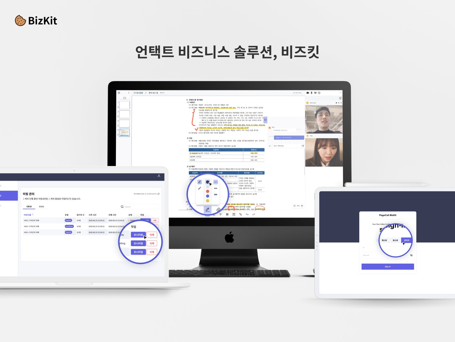 비즈킷은 맞춤형 도메인과 테마 디자인 설정을 지원하는 방식으로 고객들의 비즈니스 정체성을 제공한다. 또한 관리자 기능을 통해 미팅 참여자 아이디 일괄 생성, 미팅 참여자 사전 세팅, 미팅 별 참가 가능 인원과 진행 시간 설정, 진행 중이거나 진행 완료된 미팅 모니터링을 할 수 있다.