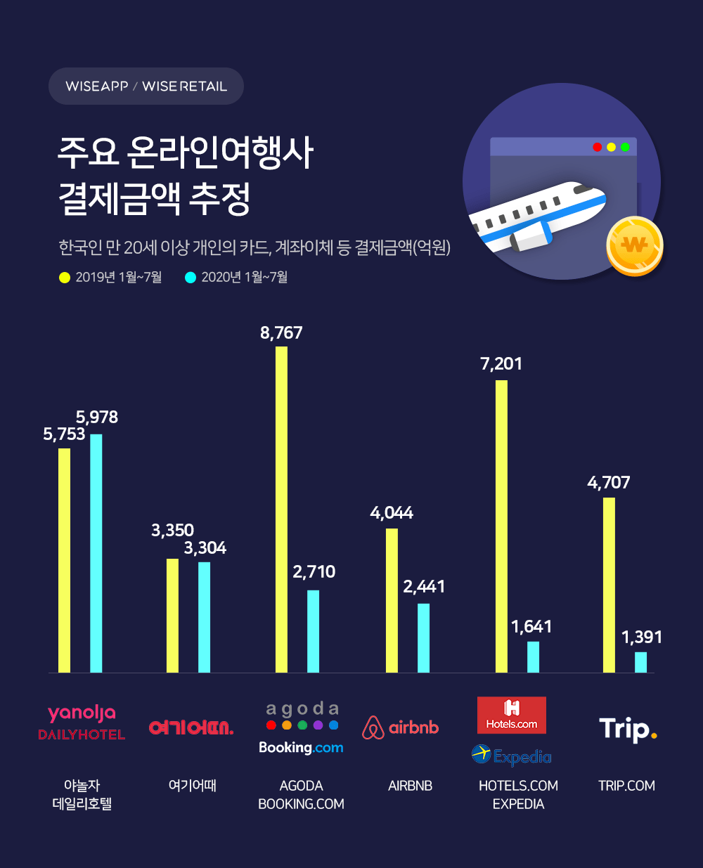 앱/리테일 분석서비스 와이즈앱/와이즈리테일이 올해 1월부터 7월까지 주요 온라인 여행사의 결제금액을 조사하여 발표했다.