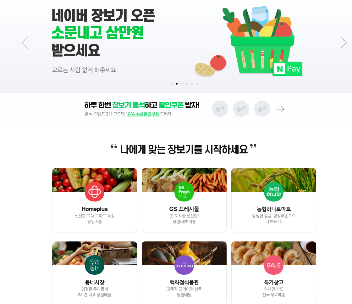 네이버는 동네시장 외에도 제휴 스토어 확대를 통해 급증해가는 온라인 장보기 시장에 진출한 셈이다. ‘장보기 서비스’에서는 전통시장 상품에 이어 마트나 현대백화점 식품관 등 스토어별 다양한 상품을 둘러보고 각 스토어별 원하는 배송 서비스를 선택할 수 있는 것이 특징이다.