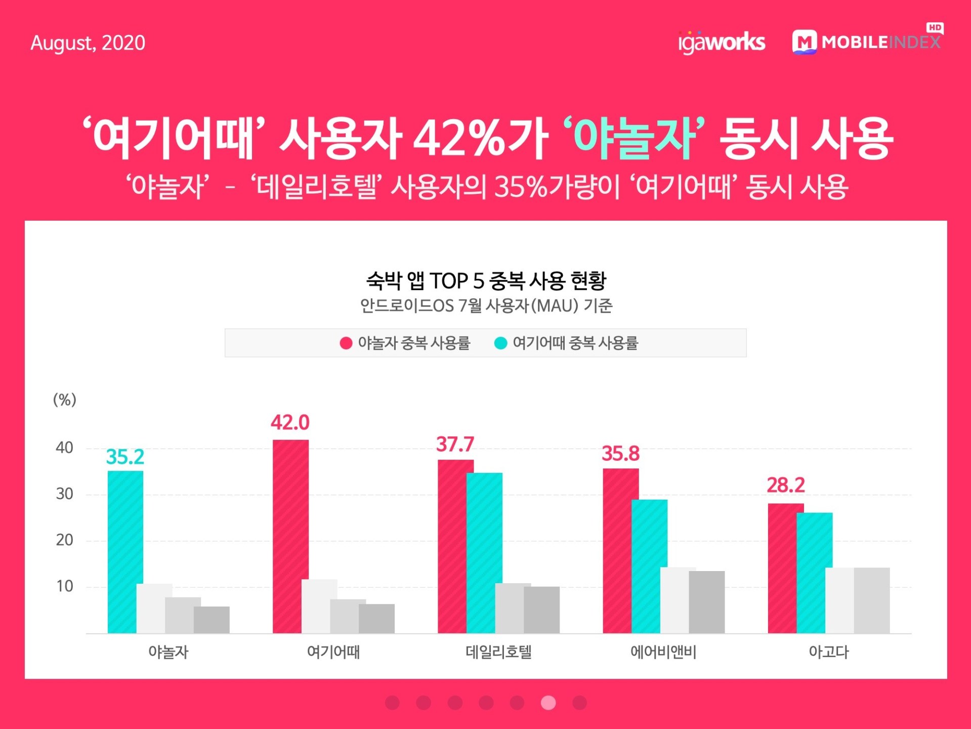 모바일 빅데이터 플랫폼 기업인 아이지에이웍스는 데이터 분석 솔루션 ‘모바일인덱스’를 통해 ‘국내외 숙박 앱 사용자 현황’ 데이터를 분석했다. 분석 기간은 2019년 1월부터 2020년 8월 16일까지로, 일평균 3500만 모바일 기기의 17억 데이터(안드로이드 OS기준)를 AI 알고리즘에 기반하여 95.9% 정확도로 분석한 것이다.