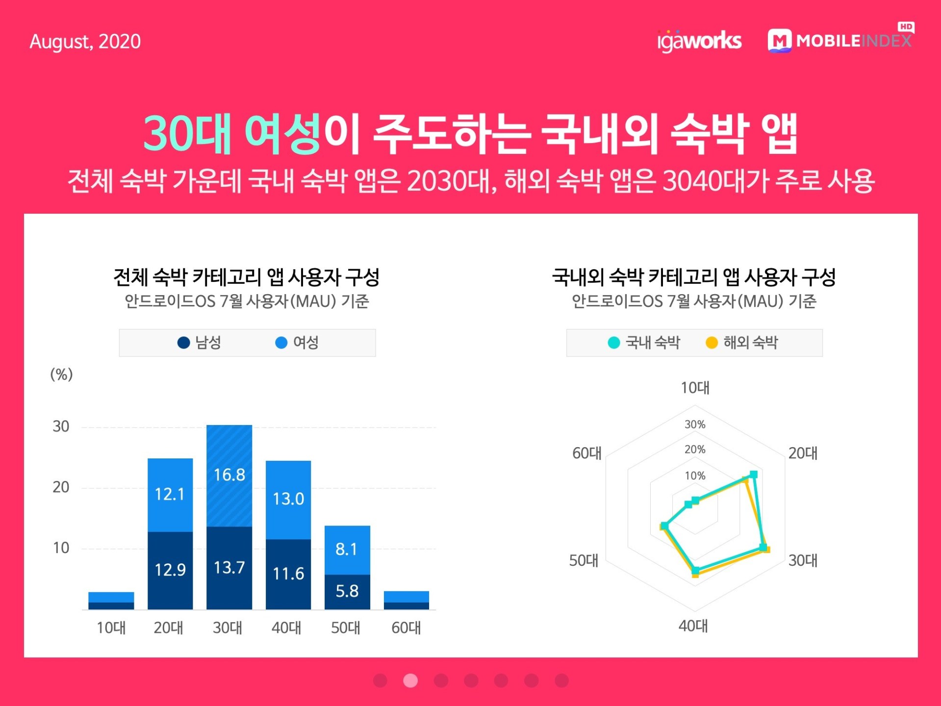 모바일 빅데이터 플랫폼 기업인 아이지에이웍스는 데이터 분석 솔루션 ‘모바일인덱스’를 통해 ‘국내외 숙박 앱 사용자 현황’ 데이터를 분석했다. 분석 기간은 2019년 1월부터 2020년 8월 16일까지로, 일평균 3500만 모바일 기기의 17억 데이터(안드로이드 OS기준)를 AI 알고리즘에 기반하여 95.9% 정확도로 분석한 것이다.