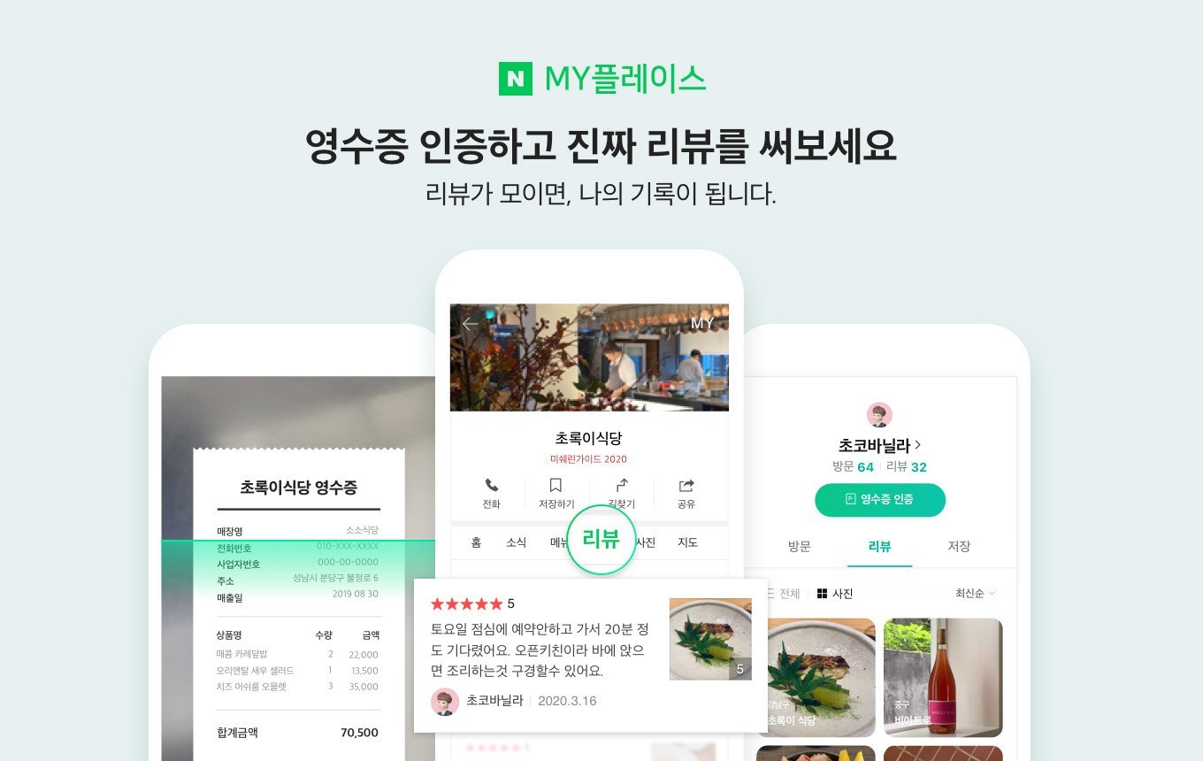 네이버는 마이플레이스의 영수증리뷰 건수가 1억 건을 돌파했다고 밝혔다. 2019년 11월 서비스 정식 오픈 이후 불과 10개월 만의 성과다. 일 평균 영수증 제출수는 65만장, 일 평균 리뷰 작성수는 40만 건에 달한다