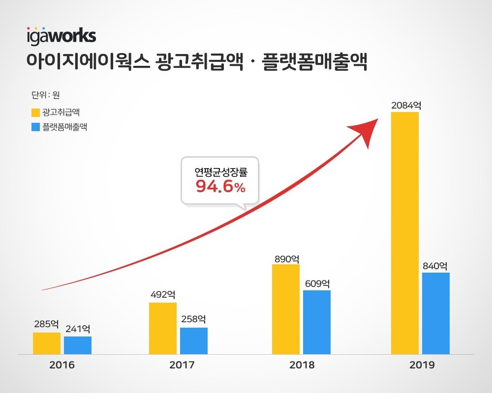 아이지에이웍스의 2019년 연간 광고취급액은 전년 대비 2.34배 증가한 2,084억원으로 2016년이후 94.6%의 연평균 성장률(CAGR)을 기록했으며, 플랫폼 매출액 역시 840억원으로 증가했다.