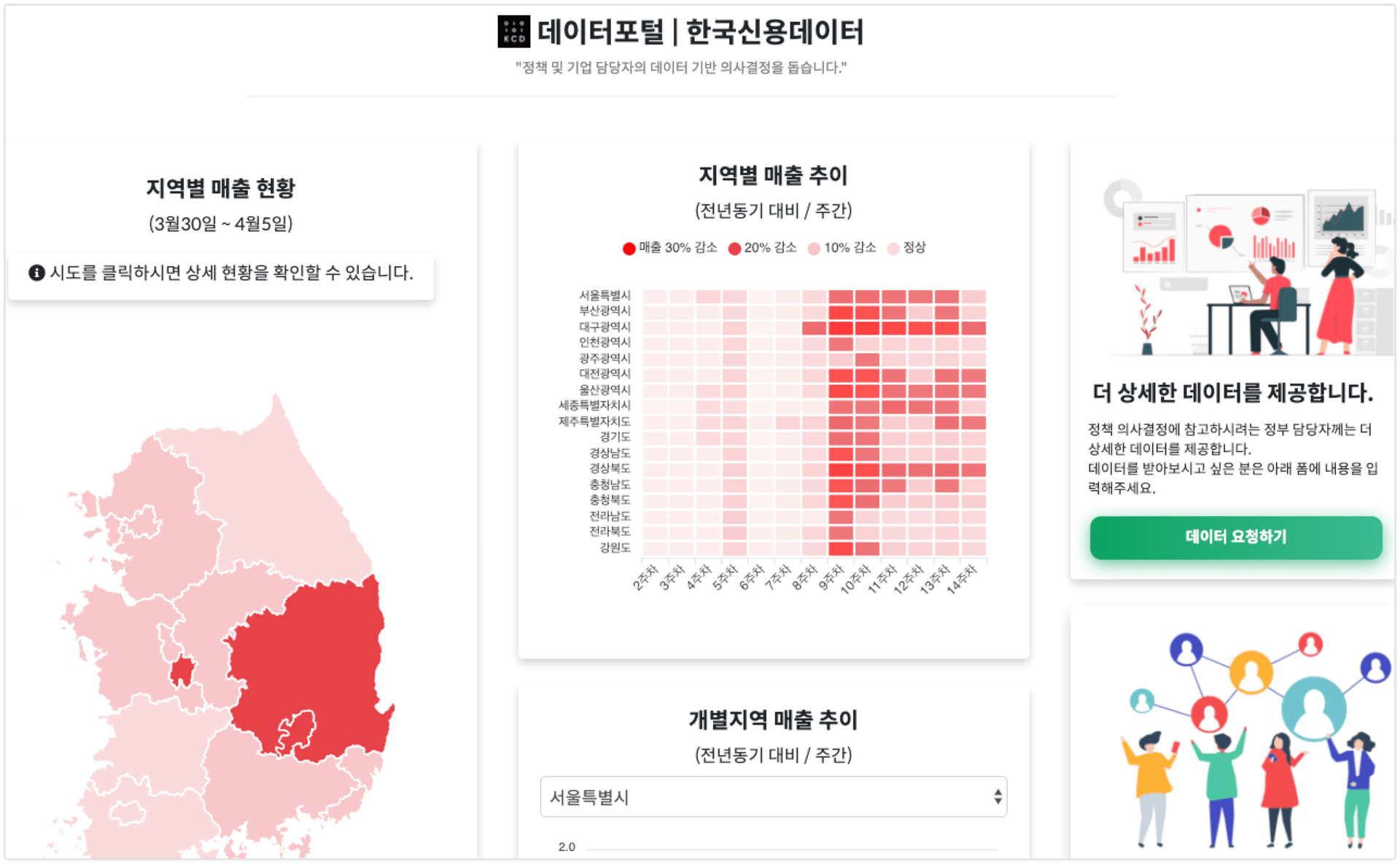 한국신용데이터는 정책 및 기업 담당자가 데이터 기반 의사결정을 내릴 수 있도록 지역별 매출 추이를 볼 수 있는 ‘데이터포털’을 오픈했다.