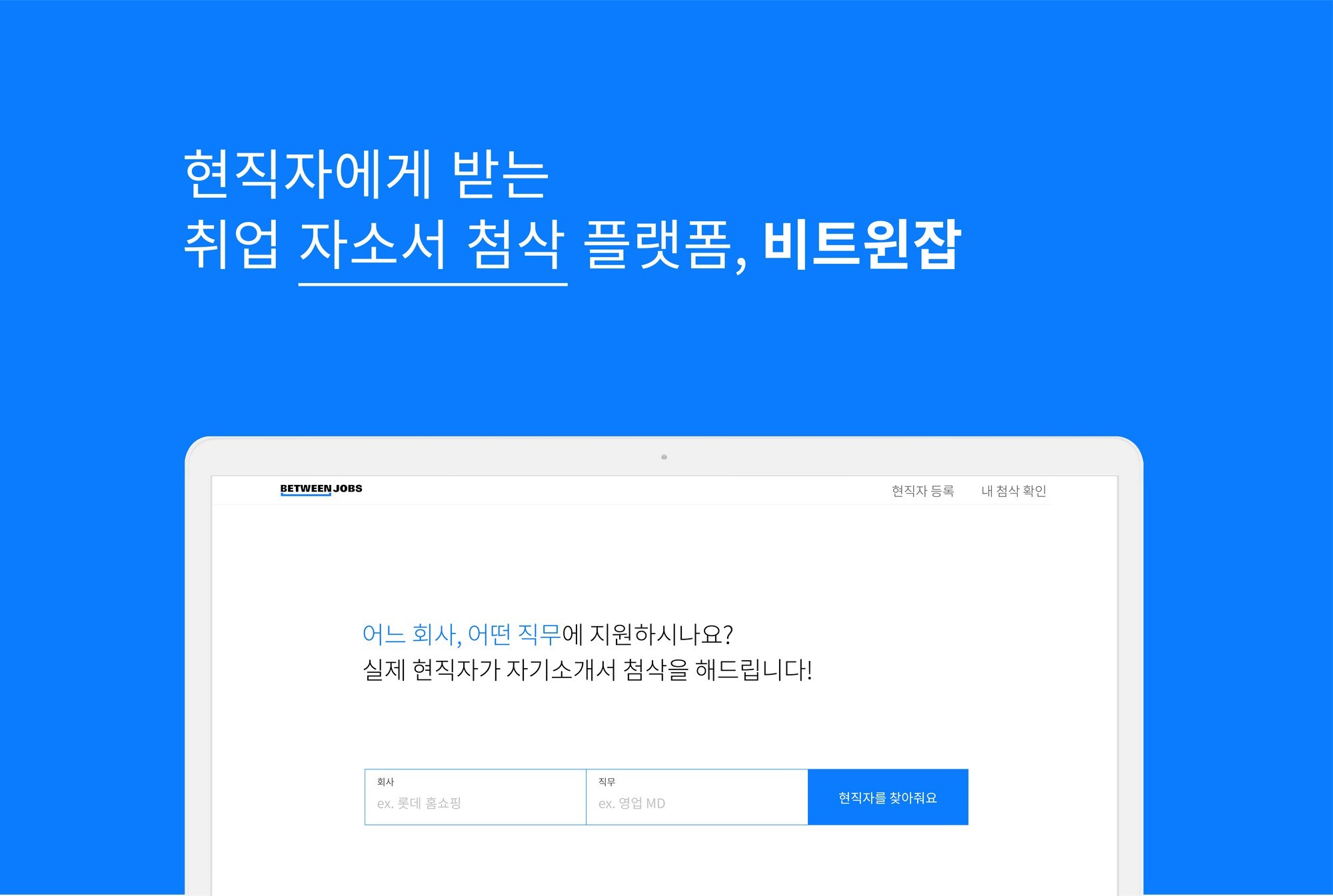 비트윈잡은 취업 및 이직을 준비하는 구직자가 지원하는 회사, 직무의 실제 현직자에게 직접 자기소개서를 첨삭 받을 수 있는 플랫폼이다. 현재 800여 회사의 1천 명 이상의 현직자가 등록되어 첨삭 서비스를 제공하고 있으며, 그 숫자는 월평균 40%씩 늘어나고 있다.