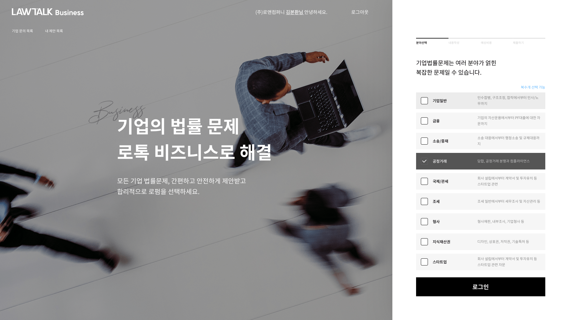 법률 플랫폼 ‘로톡(LawTalk)’이 기업법무 플랫폼 서비스 시장 개척에 나선다. 로톡을 운영하는 로앤컴퍼니는 기업법무 플랫폼 서비스인 ‘로톡비즈니스’를 출시했다고 11일 밝혔다. 로톡비즈니스는 법률서비스를 원하는 기업과 로펌을 연결해 주는 B2B 플랫폼이다.