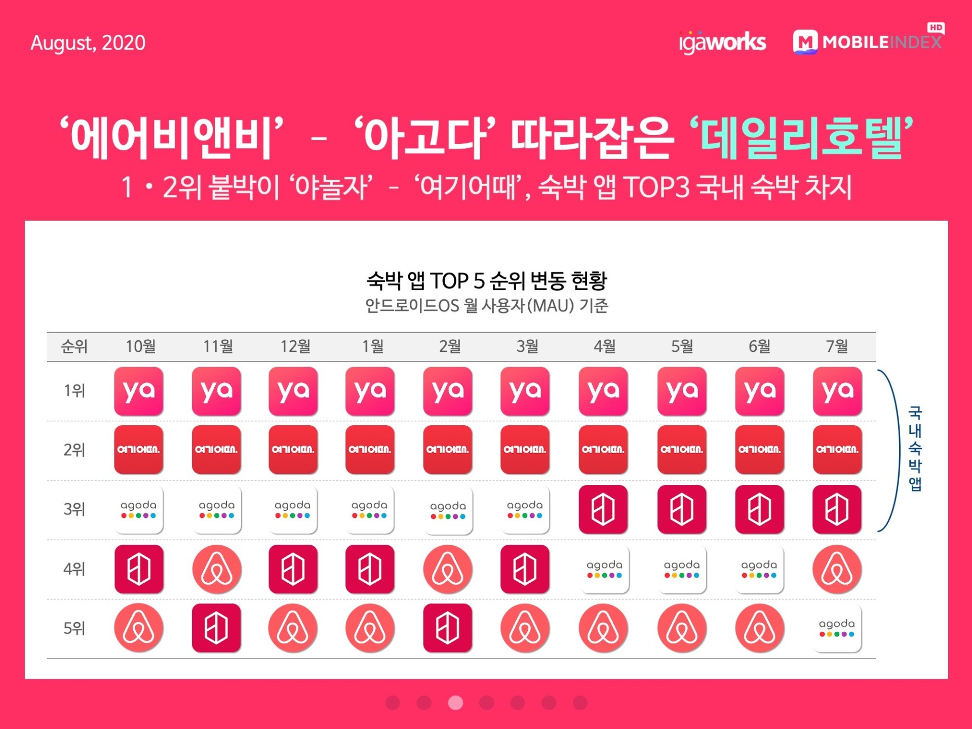 지난 해 숙박앱 순위 5위에 머물었던 데일리호텔이 지난 4월 이후 아고다와 에어비앤비를 제치고 3위에 올라선 것도 주목할만하다. 코로나19로 인해 해외여행이 어려워지면서 국내여행이 주목받는 시기와 일치한다.