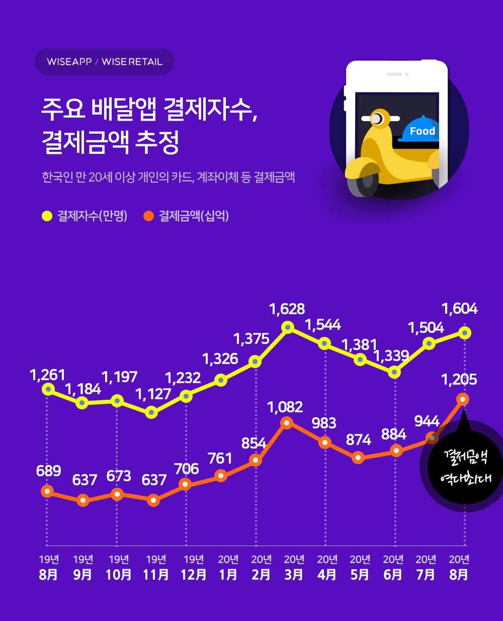 한편, 와이즈앱은 지난 8월에 딜러버리히어로가 품고 있는 배달의민족, 요기요, 배달통, 푸드플라이 등을 통해 결제된 금액이 1조2천억원을 넘어섰다고 발표했다. 패널조사를 통해 추정 값이긴 하지만, 지난 7월의 9,400억원과 비교하면 큰 폭으로 증가한 것을 확인할 수 있다. 코로나19 재확산에 따라 배달 수요가 증가한 것으로 추측된다.