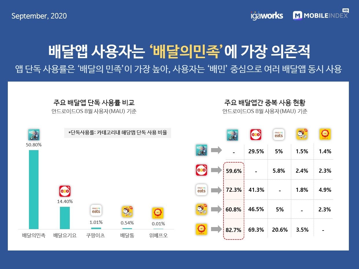 ‘쿠팡이츠’는 신규 유입 증가로 2020년 8월, 안드로이드OS 기준 MAU가 70만을 돌파해 작년 동기 대비 월 사용자 수가 4배 이상 증가했고, ‘위메프오’의 경우 사용자 수가 꾸준한 증가세를 보이며 2020년 8월, 전년 대비 사용자 수가 7배 늘었다.