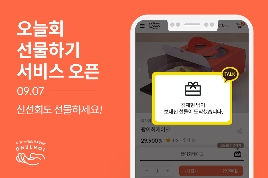 김도영 기술개발총책임자는 “오늘회는 부모님과 지인에게 회와 수산물을 선물하는 주문건수가 많았고, 주소를 알아야만 보낼 수 있었던 불편함을 개선하여 쉽고 빠르게 마음을 전할 수 있게 개발하였다”며 “오늘회 선물하기로 수산업에 새로운 선물 문화를 선도하고 신선식품도 선물할 수 있다는 인식을 만들어 나갈 수 있도록 계속해서 서비스를 이뤄가겠다”고 밝혔다.
